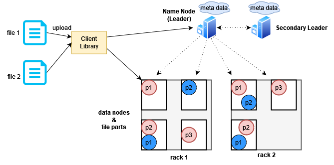 We will store our large files by dividing them into smaller chunks and storing them on different data nodes. However, there may be problems if a machine is running out of space or if the data is located on a specific machine, who will tell that? For this purpose, we will have a leader node. The leader node will be the manager of the entire file system and will provide information about which data is stored on which machine.